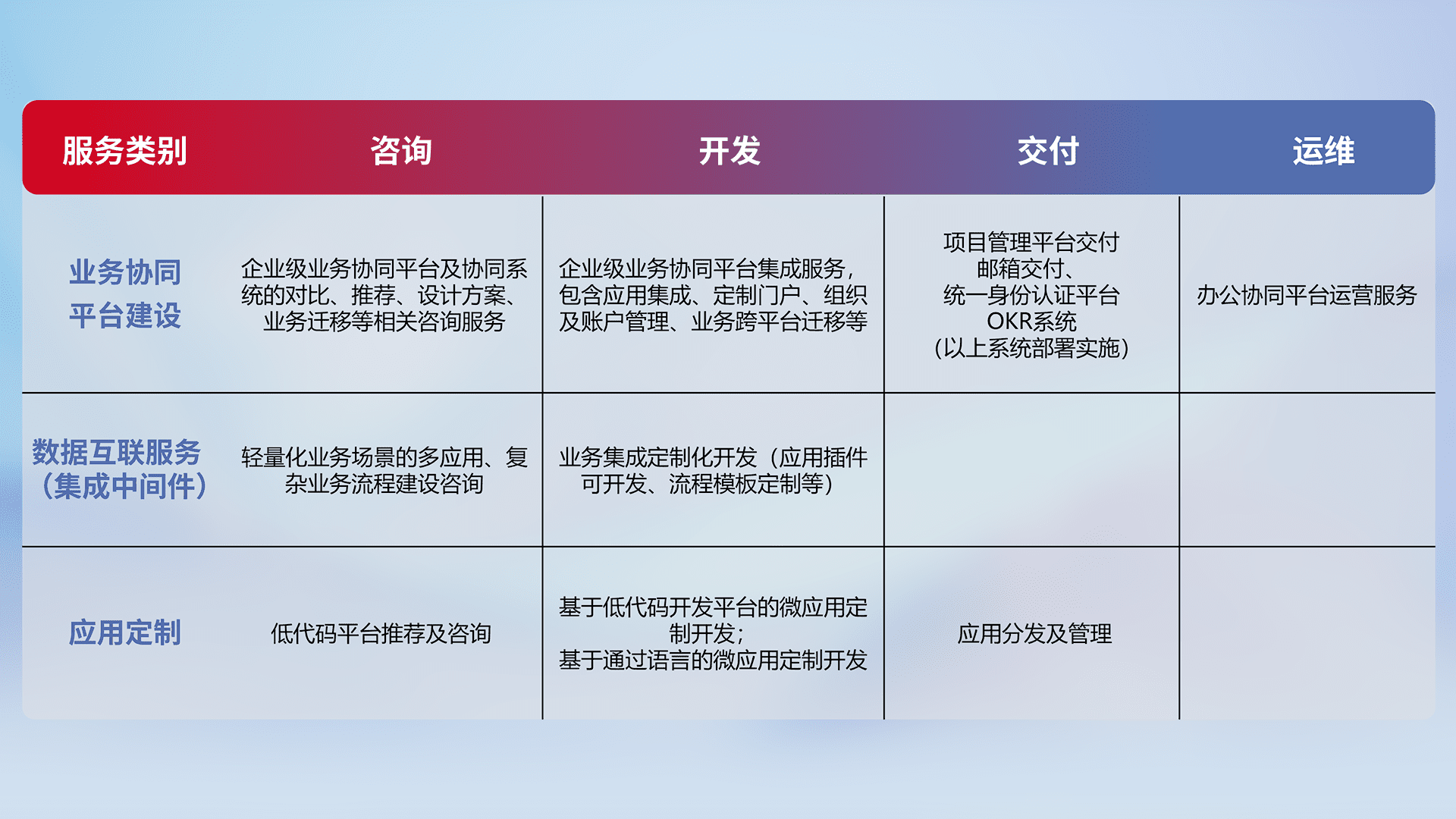 针对钉钉、、企微、、、IDaas等平台级产品提供产品的规划、、方案、、交付、、定制化开发等服务,,,,实现如统一协同办公、、、、智能客户服务、、混合会议管理、、、、智能数据查询、、、、等业务场景,,,,实现数字化转型。。。